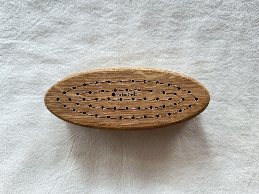 Bath brush of oak and horse hair with a good grip for the hand. Horse hair is an excellent material in bathing brushes because it is soft and pliable while it is sturdy and durable and has a certain elasticity. Along with a good soap it gives a soft and comfortable lather for a perfect cleaning. Allow the brush to dry standing on the horsehair so that the water is transported away from the wood that is more sensitive to moisture.