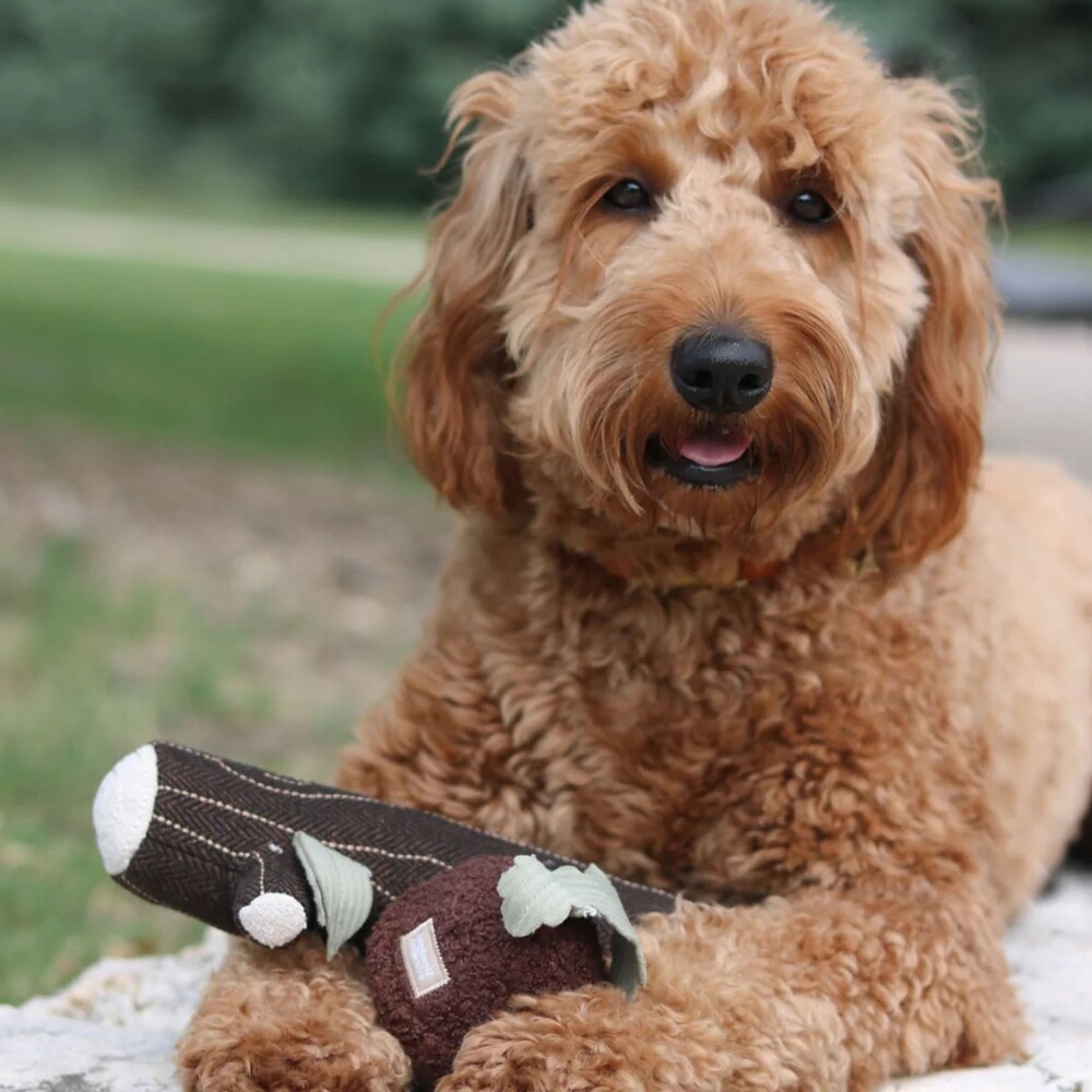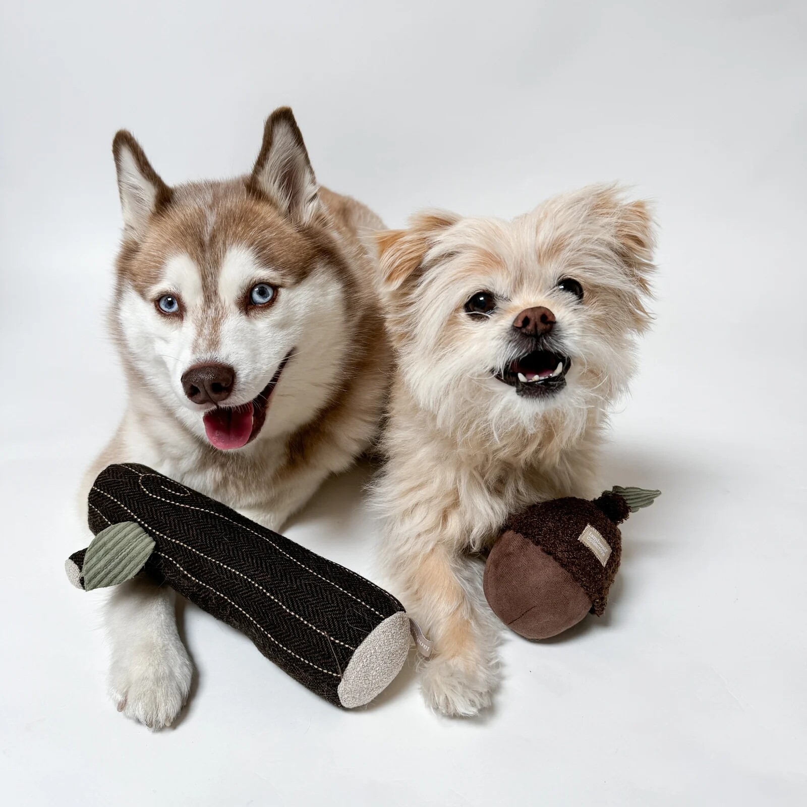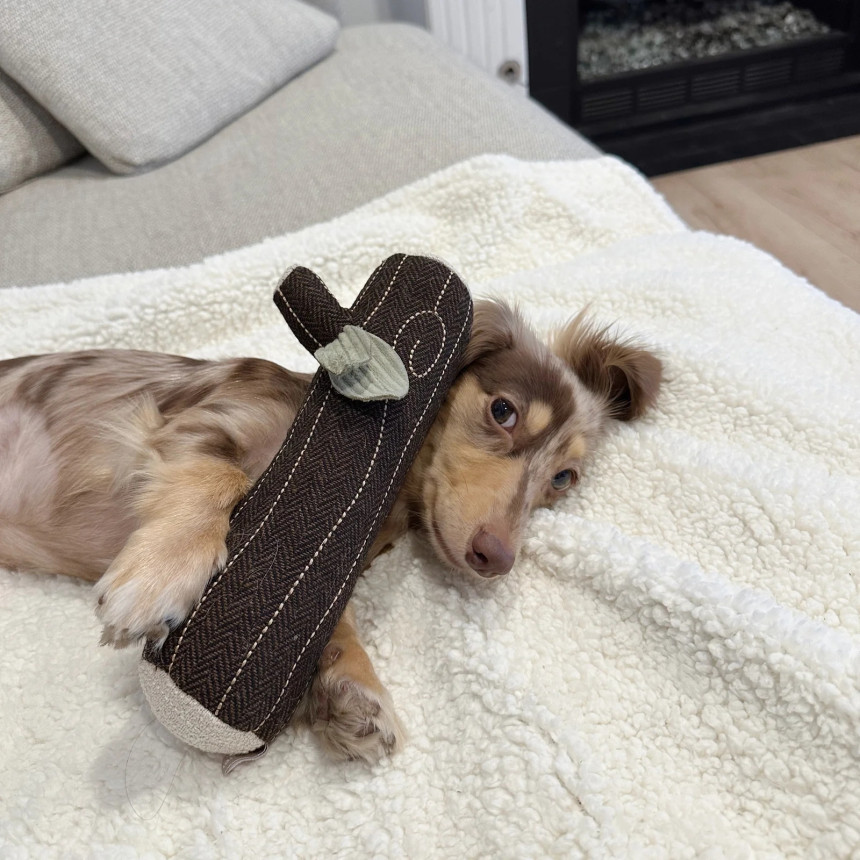 Our super squeaky FIRE LOG is made with a luxurious herringbone fabric and has a bottle super squeaker inside and extra squeakers at both ends as well. Campfire season anyone?