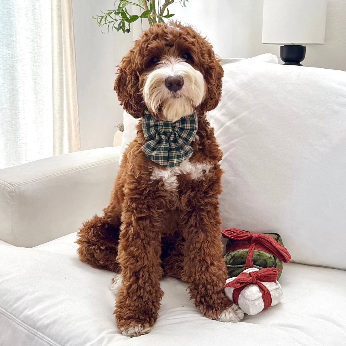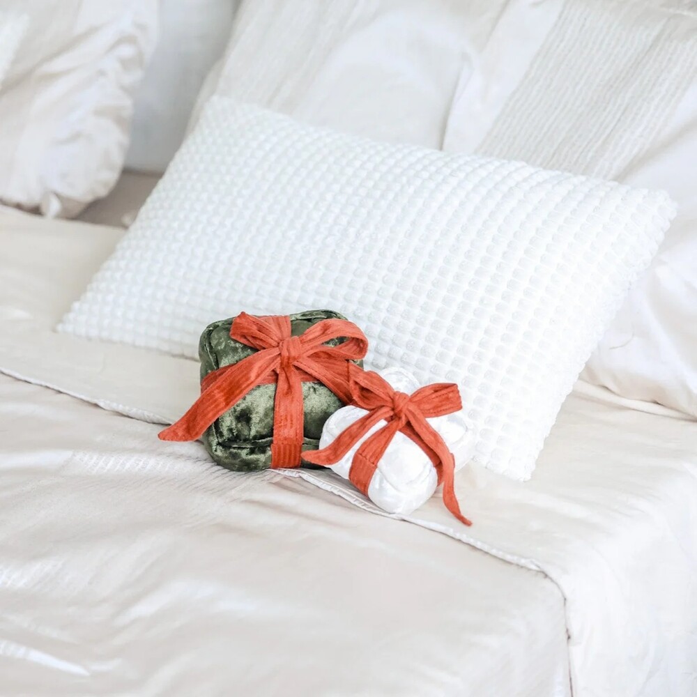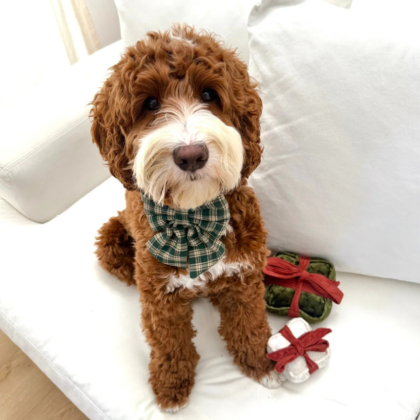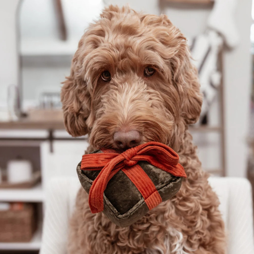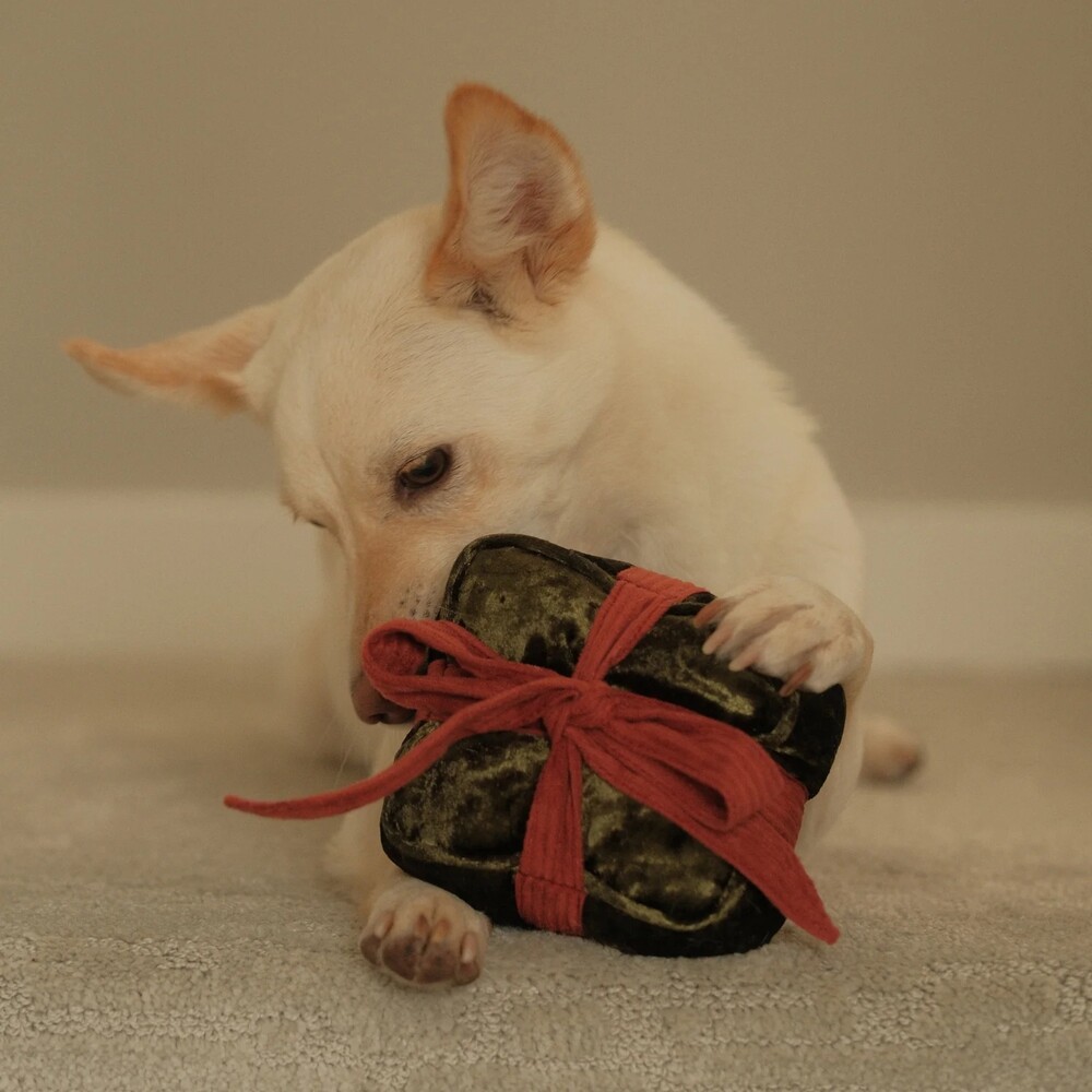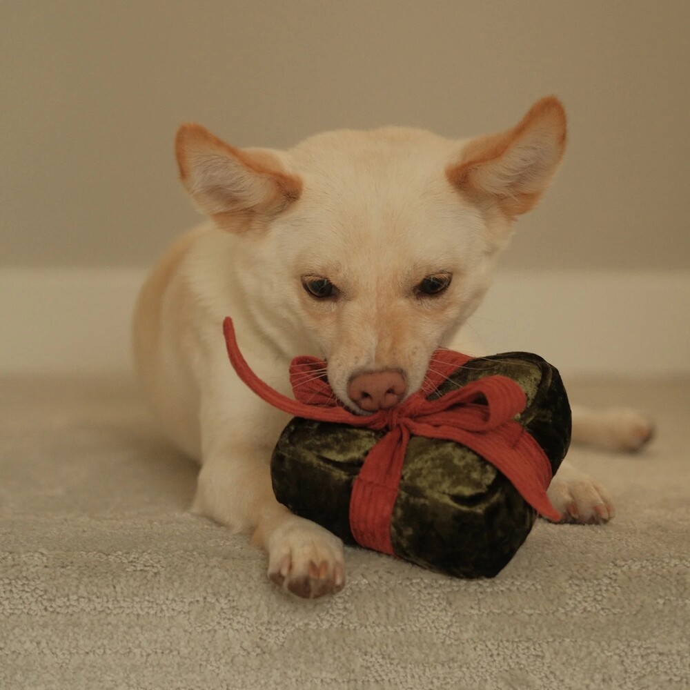 홀리데이 박스는 삑삑 소리가 나고, 위에 간식을 끼울수 있는 리본 장식이 있어요. 끈을 좋아하는 아이들이 리본묶음을 풀면