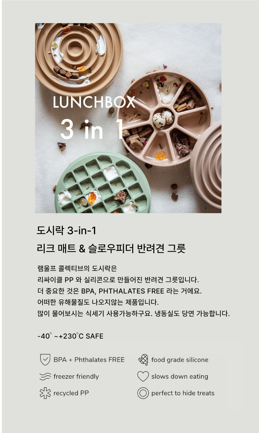 또한 도시락은 릭 매트와 슬로우 피더를 결합한 제품으로, 두 가지 기능을 하나에 모두 제공하는 형태입니다.