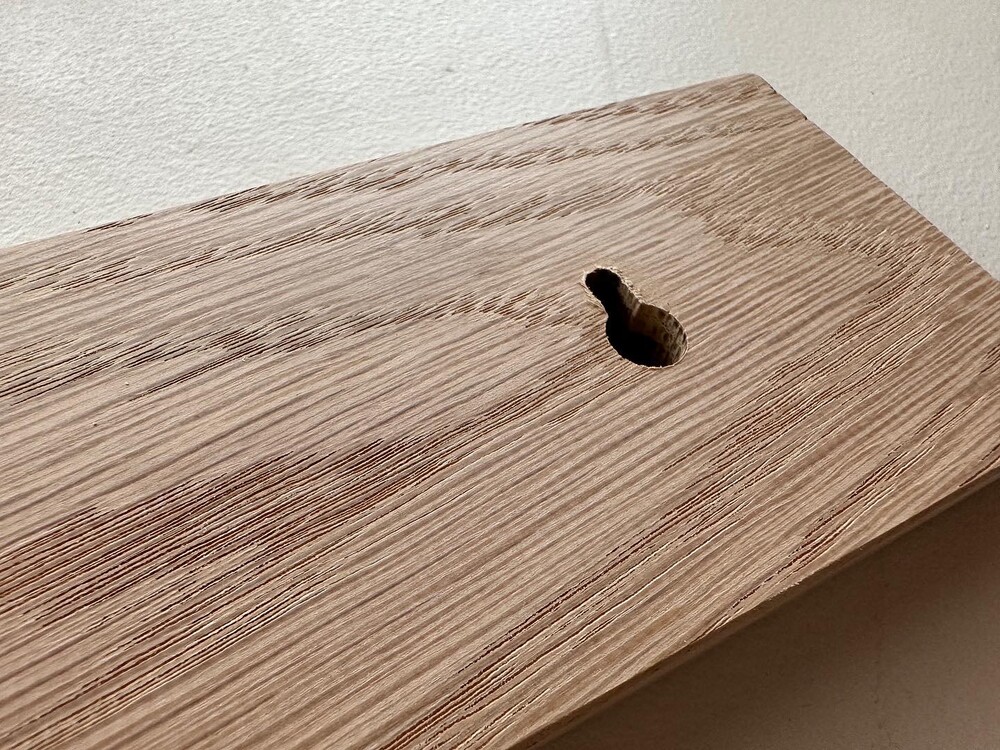 4. 나이프렉 후면 피스구멍 중 큰 부분에 피스머리가 들어가도록 넣고 아래쪽 방향으로 내려주면 좁은 쪽으로 피스가 고정됩니다.