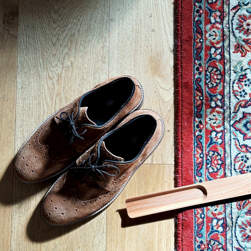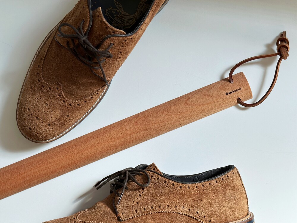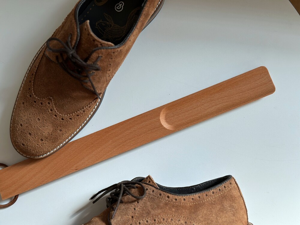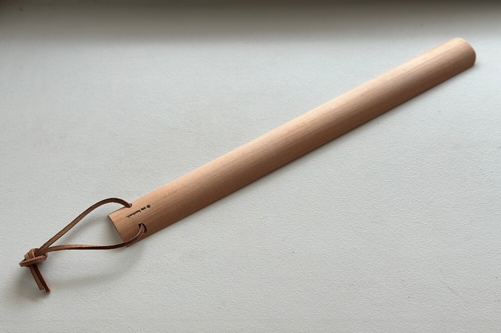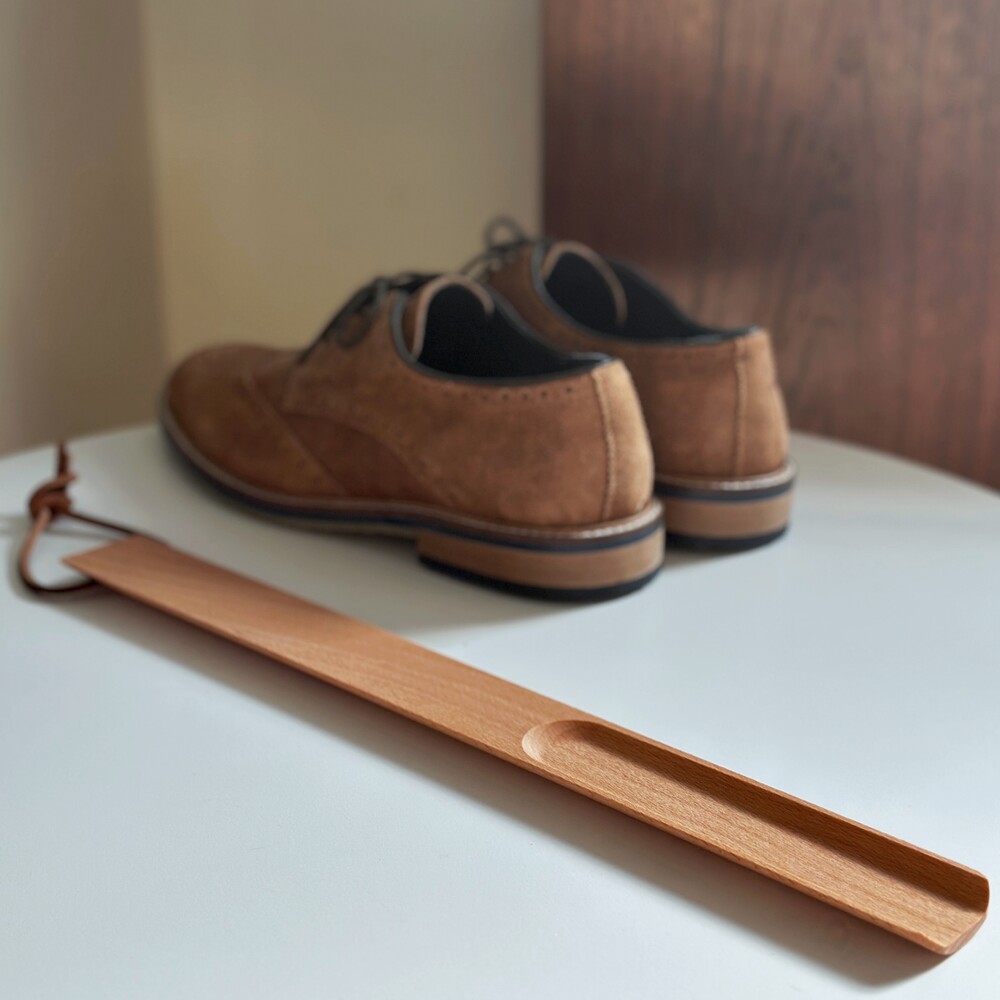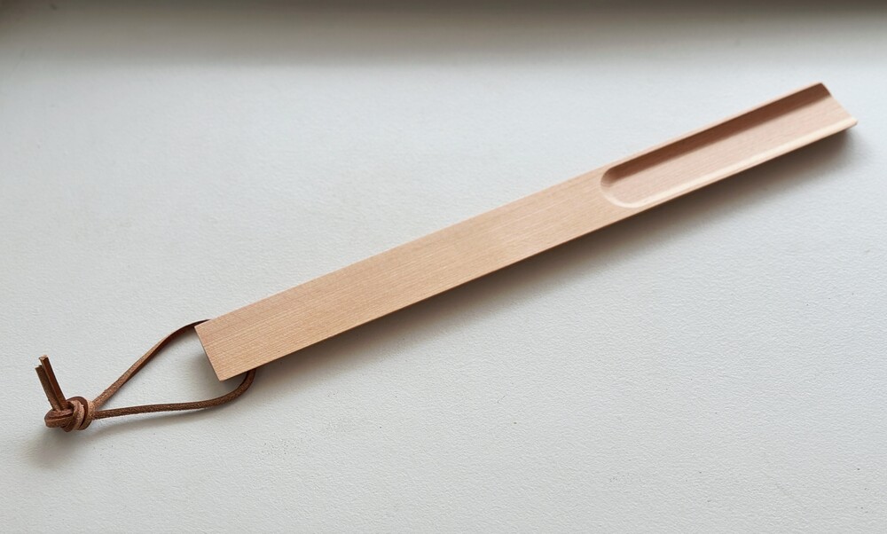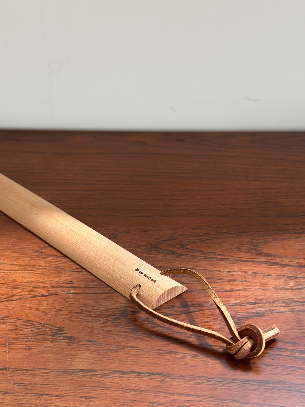 Shoehorn in oiled beech with a leather strap for hanging. Practical and stylish in the hall, with a lengh that makes you don´t have to bend down to put on your shoes. Extends the life of your shoes by tearing less on the pleat and heel portion during use.Usage: Note that a shoehorn in wood is not as flexible as one in plastic; it can´t bare the weight of your entire foot. Therefore, do not push down and pull up gently.